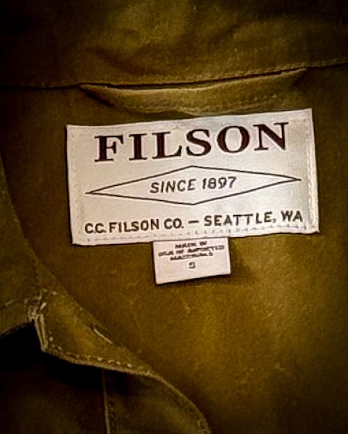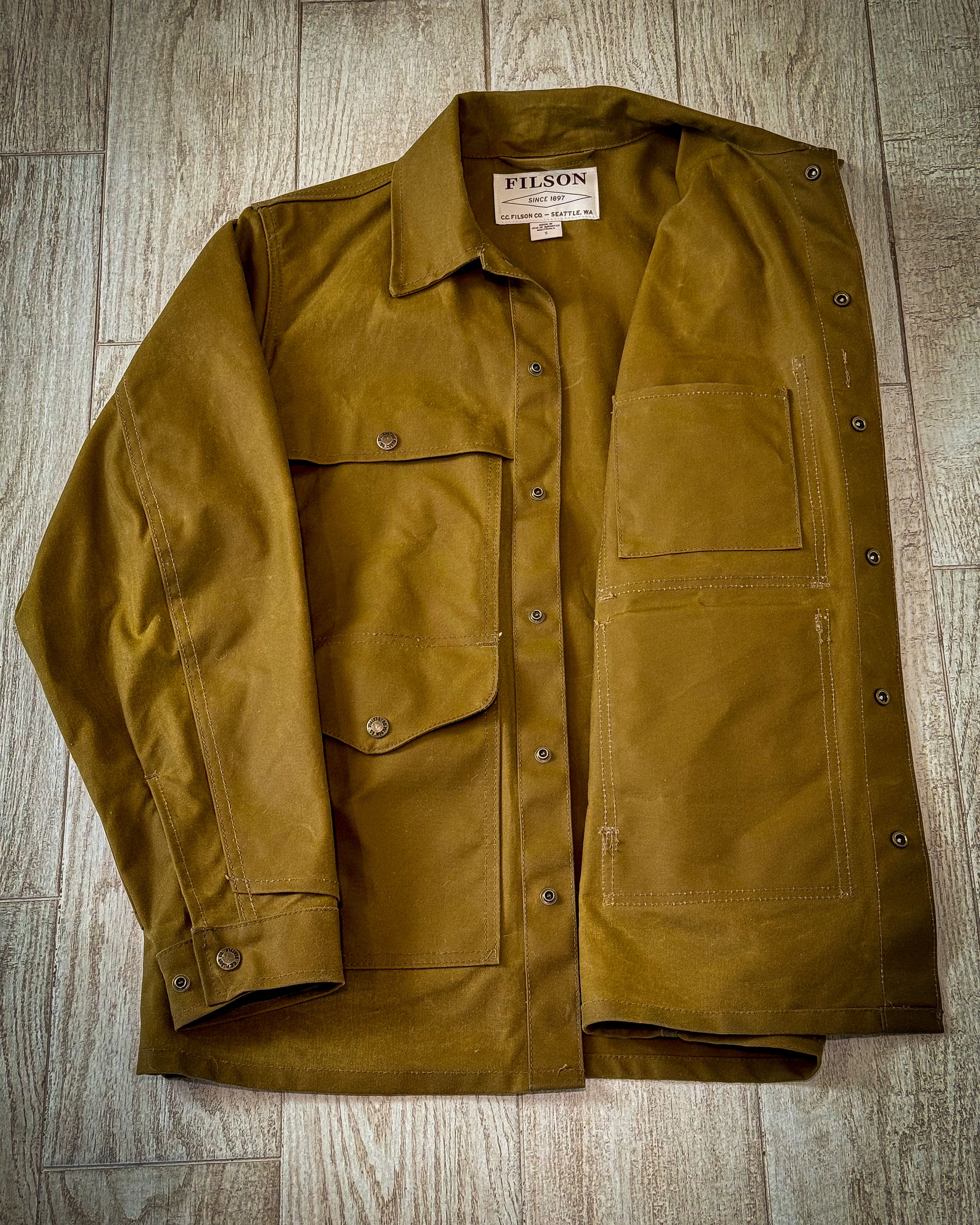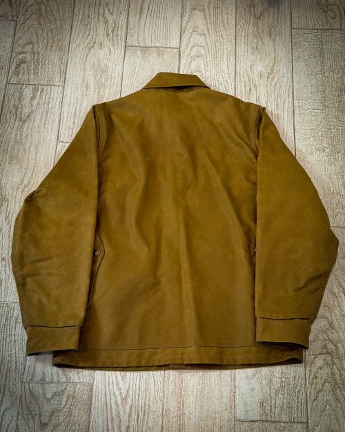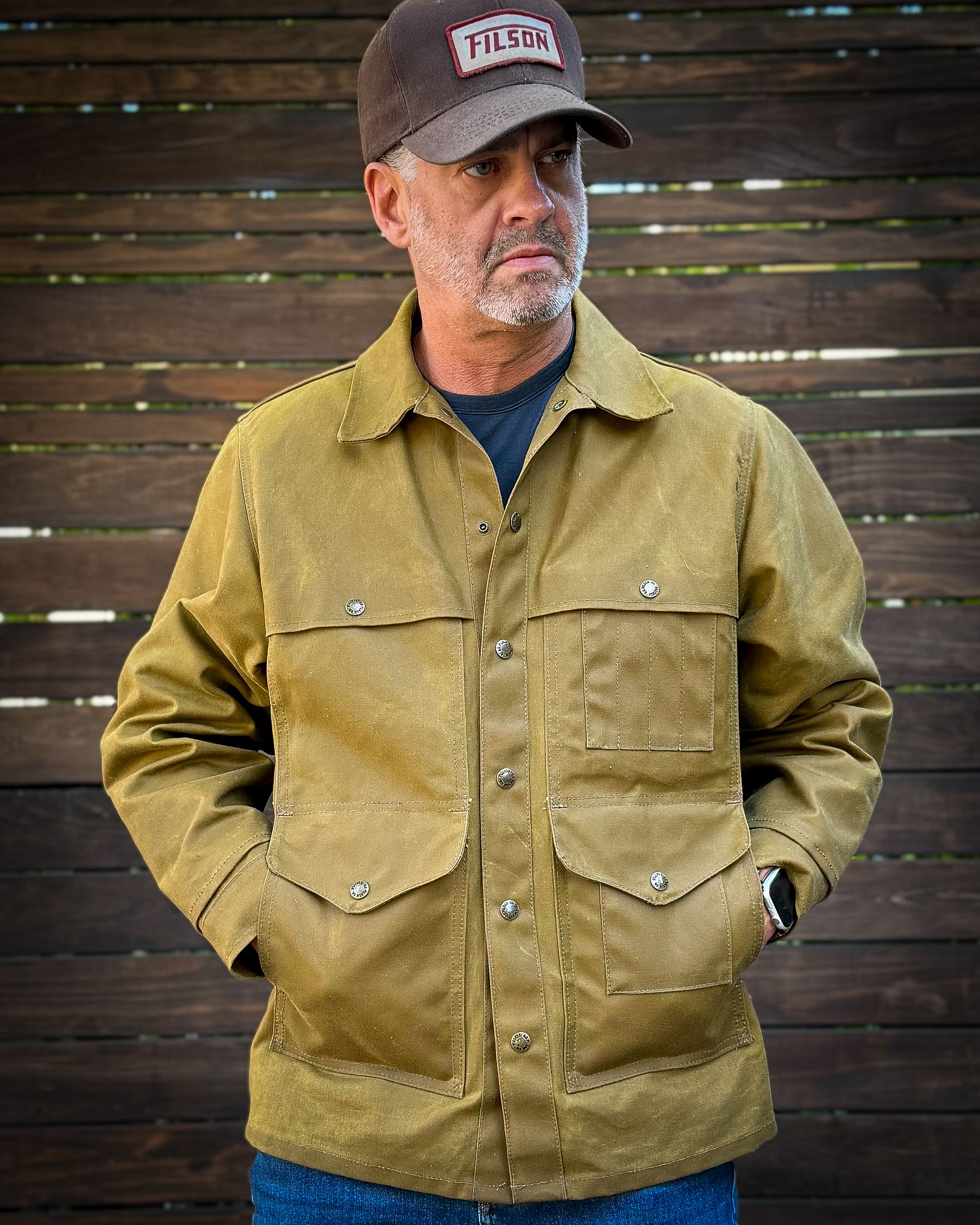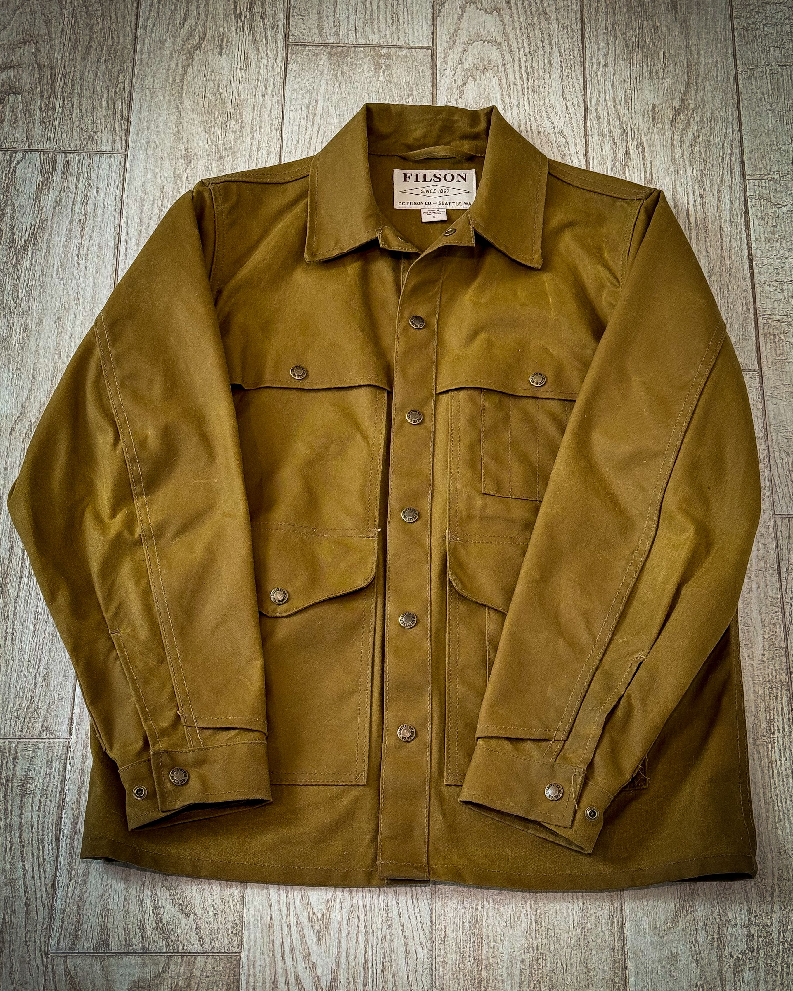 Small Filson Dark Tan Tin Cloth Cruiser Jacket. Note that Filson sizing runs big, and the small fits like a medium to large. This is your chance to get a new (only worn in photos) Tin Cloth Cruiser for a great deal.