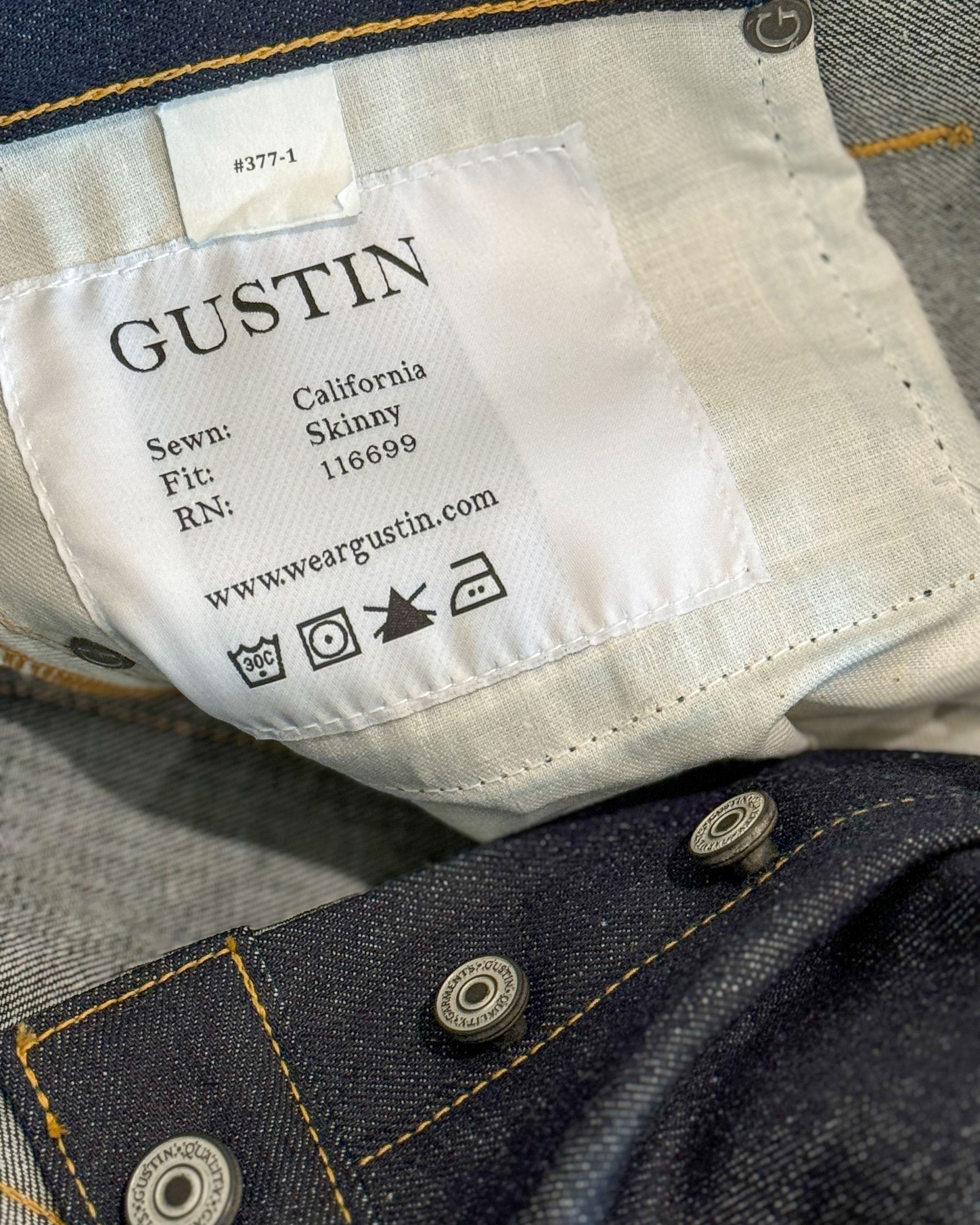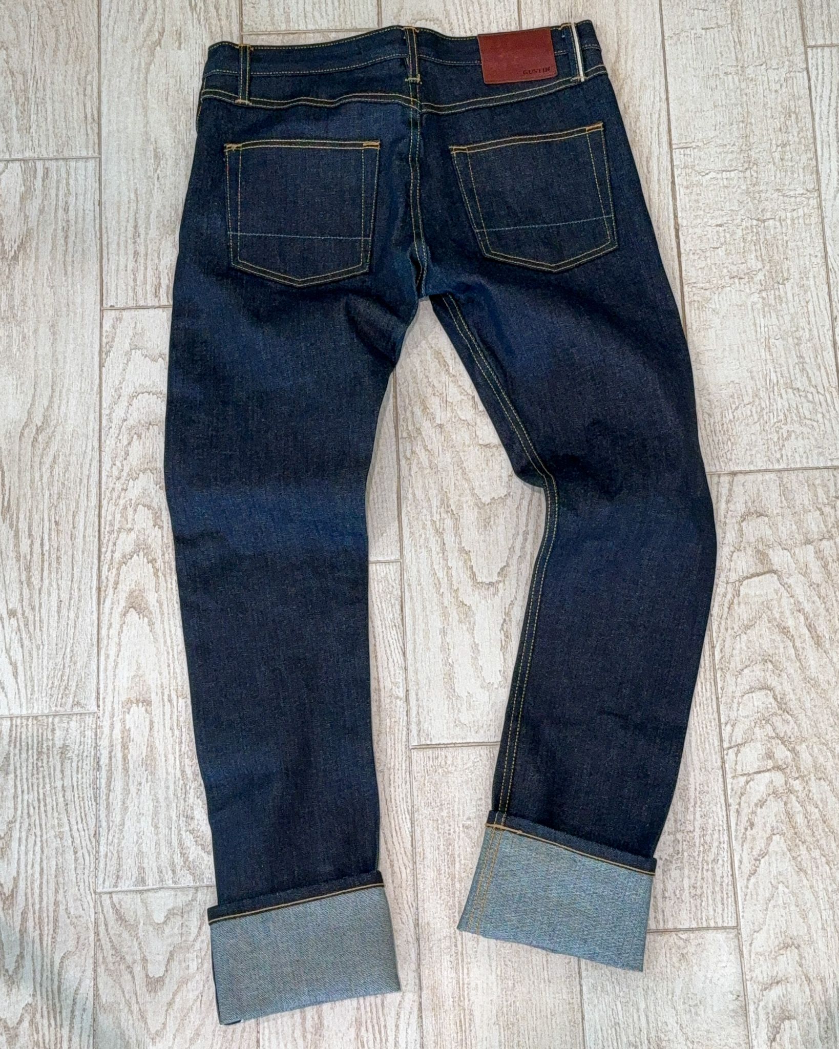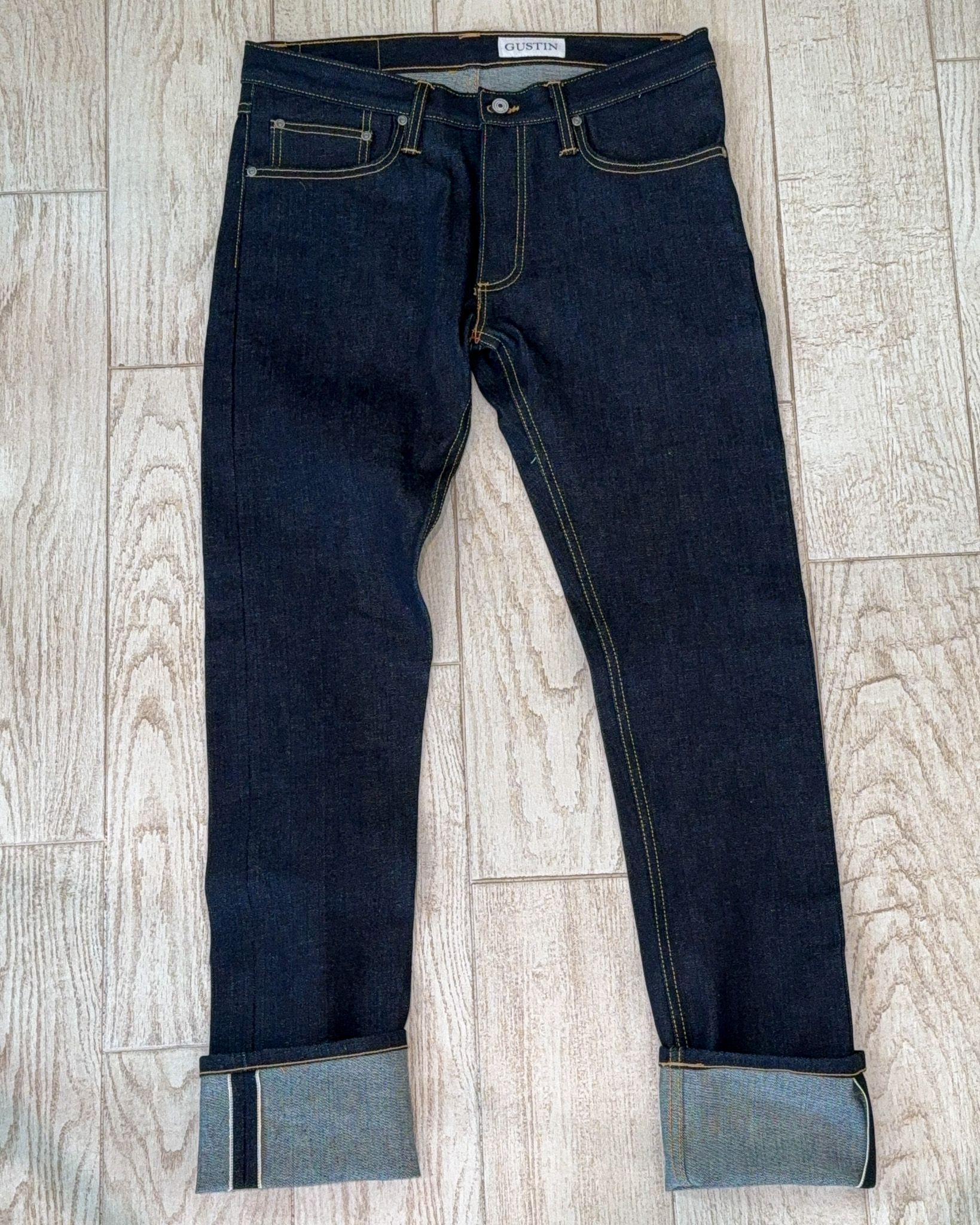 I only have tried them on, and they're too big for me. Fit: Skinny Fabric: Cone Mills #377 USA Selvedge, 11.5oz, Red ID 98c/2p Finish: Raw, Contrast Stitching Trim: Gustin hardware, hand-stamped leather patch