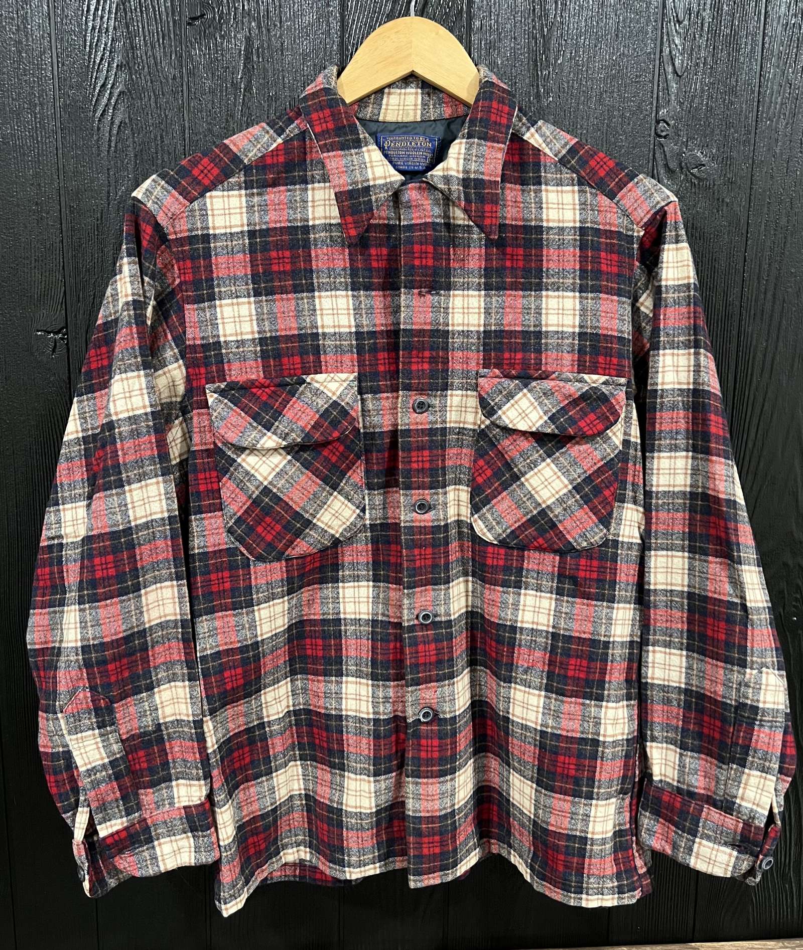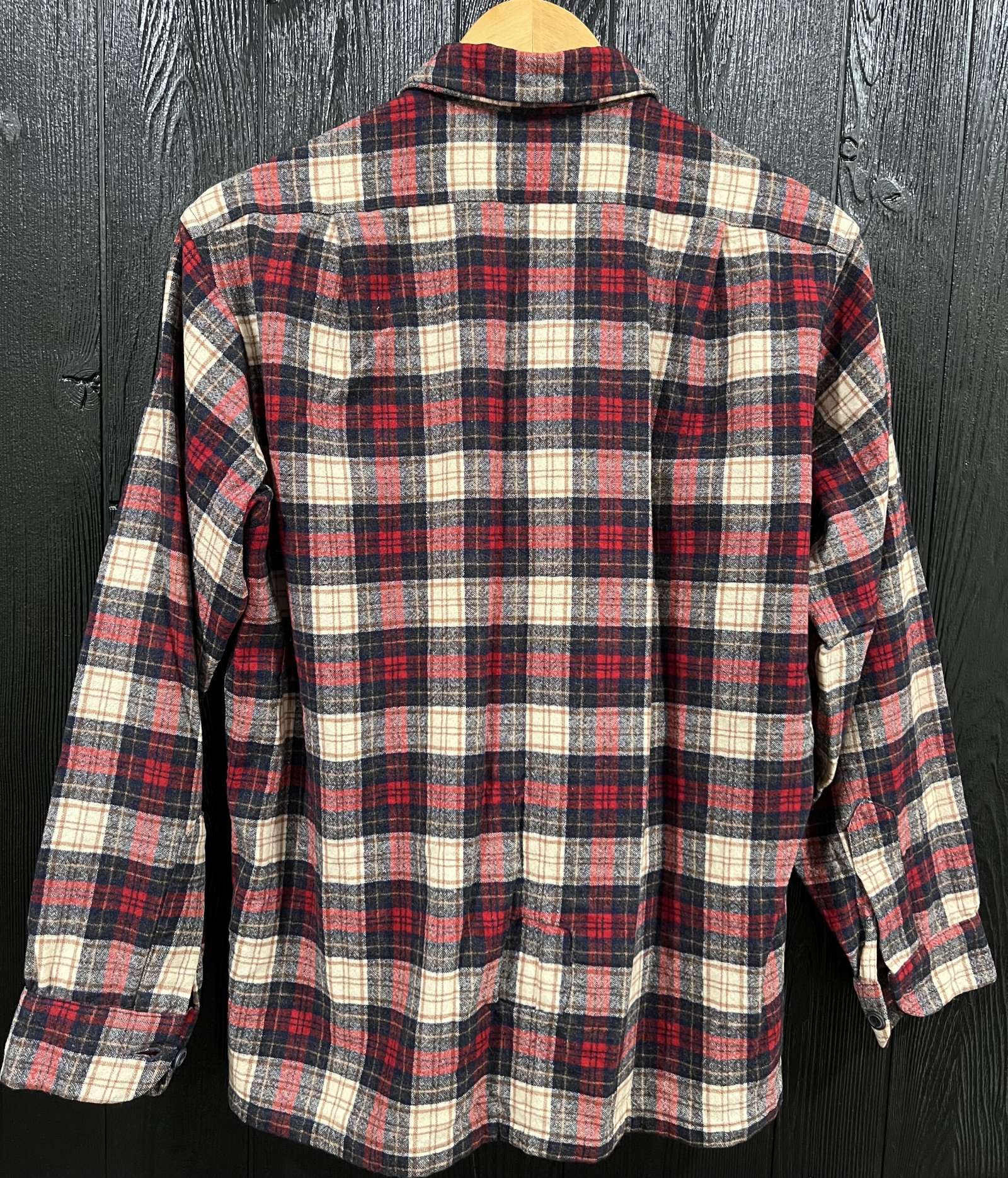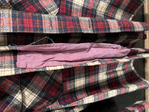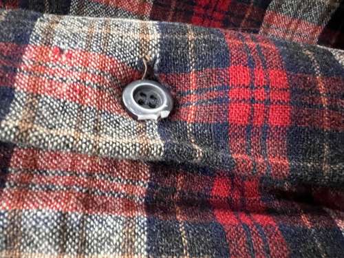 Vintage 1980s (I think) Pendleton flannel! It’s well loved, had a hole that was patched with some fabric from the inside of the button flap. Missing a top button, and a chipped bottom button. Pretty fun piece for layering, too small for me though.